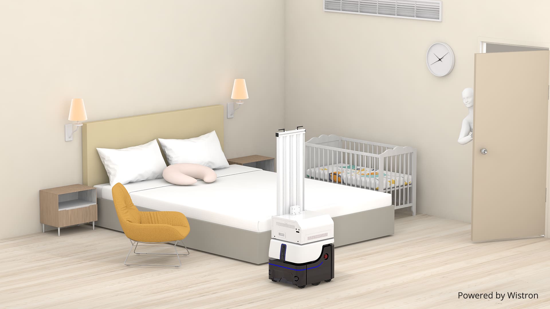 而針對環境清消,緯創資通股份有限公司機器人暨人工智慧研發處處長林書毅認為,派員進行消毒作業,特別是高風險場域,一旦稍有閃失就可能將感染源帶出、甚至染病。若能讓人員遠離現場改由機器人代勞,既可降低感染風險又能達到維護環境安全的目的。