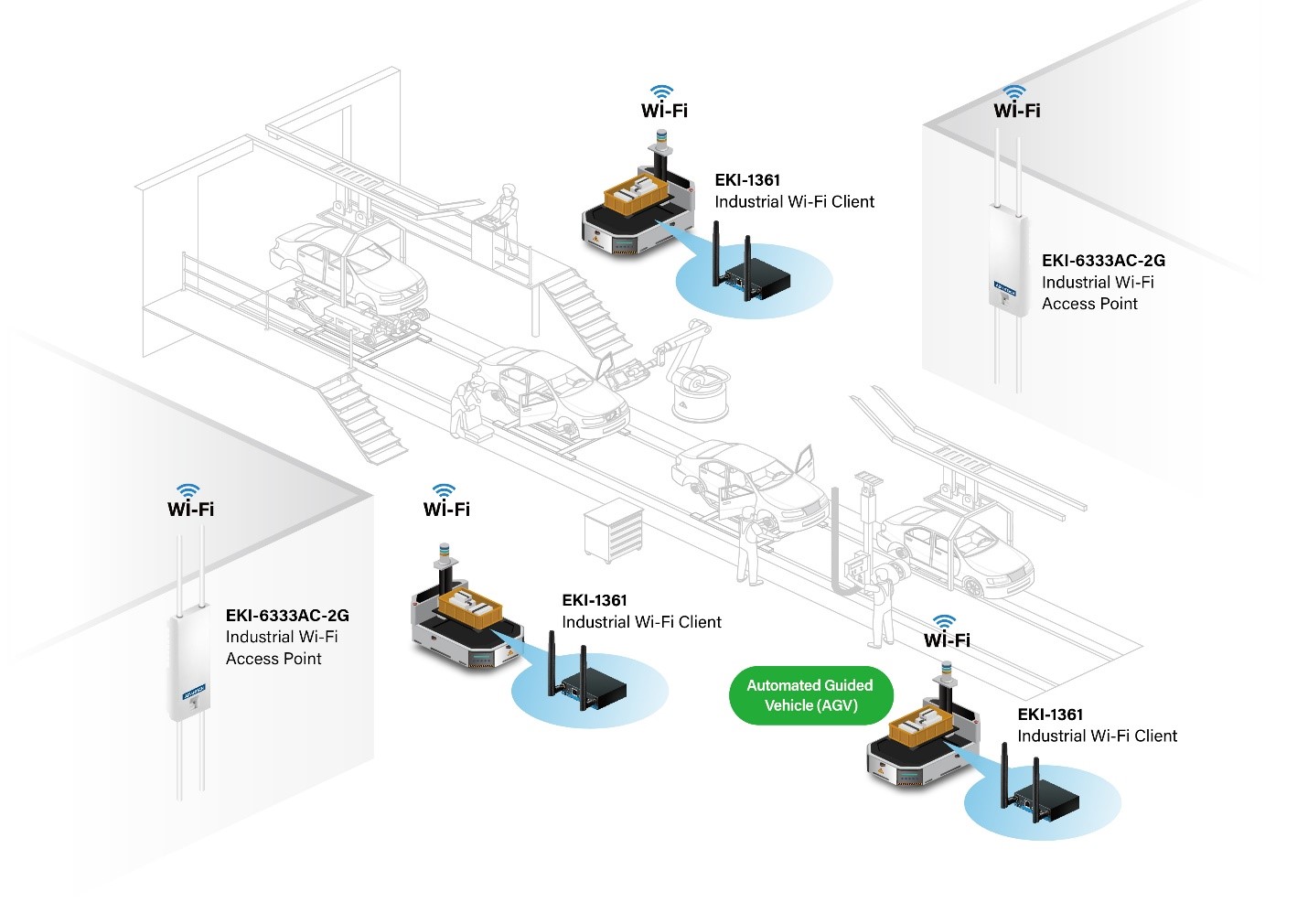 研華EKI-1361 Wi-Fi客戶端提供100ms極速漫遊速度,並兼容多個AP進行快速訊號切換,確保AGV控制數據的流暢傳輸。 結合EKI-6333AC系列Wi-Fi AP,使製造商能夠在整個應用現場建立全面的訊號覆蓋,並為AGV小車部署多種無線通信解決方案。