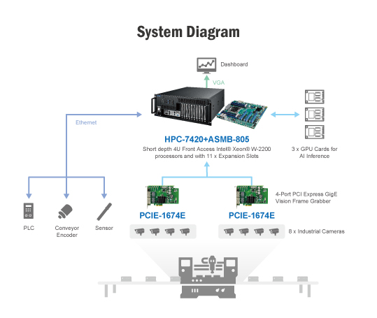 어드밴텍의 산업용 추론 서버(HPC-7420 + ASM-805)를 검사 플랫폼의 중심으로 삼아 그 답을 얻었습니다. AOI 솔루션에는 HPC-7420 및 ASMB-805 산업용 추론 서버가 포함되었습니다. 서버는 플랫폼의 육안 검사를 위해 8개의 개별 카메라에 연결됩니다. GPU 처리는 ASMB-805를 통해 흐릅니다. 10개의 CPU 코어가 장착된 Intel® Xeon® W-2255 프로세서로 구동되는 ASMB-805 서버 보드는 GPU 카드, NIC 카드 및 프레임 그래버에 대한 최대 3개의 PCIe x16 및 2개의 PCIe x4 연결을 지원합니다. GPU를 통한 이미지 처리는 PLC로 오프로드되어 고해상도 이미지 분석을 대시보드로 확장할 수 있습니다.