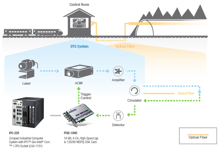 By perfectly integrating the two products, the DAQ system is capable of triggering acousto-optic modulators (AOMs) that control lasers to send a laser pulse of set width to the propagator and then to the optical fiber cable, while also receiving the backscattered signal of the laser pulse source from the photo transducer. After processing on the host computer, the signal shows the temperature distribution for the entire temperature sensing cable. The PCIE-1840 digitizer is the most important component of the solution because it is this hardware that simultaneously triggers transmissions of the laser pulse while receiving the backscattered signal. This digitizer,with its sampling rate of up to 125 MSPS, 16-bit resolution, and four simultaneous analog input channels, enables precise and speedy data collection. Moreover, the inclusion of 2 GB of onboard memory satisfies the requirements for high-speed data transmissions. Data transmissions through CPU-independent DMA accelerate the overall transmission rate and reduce CPU load.