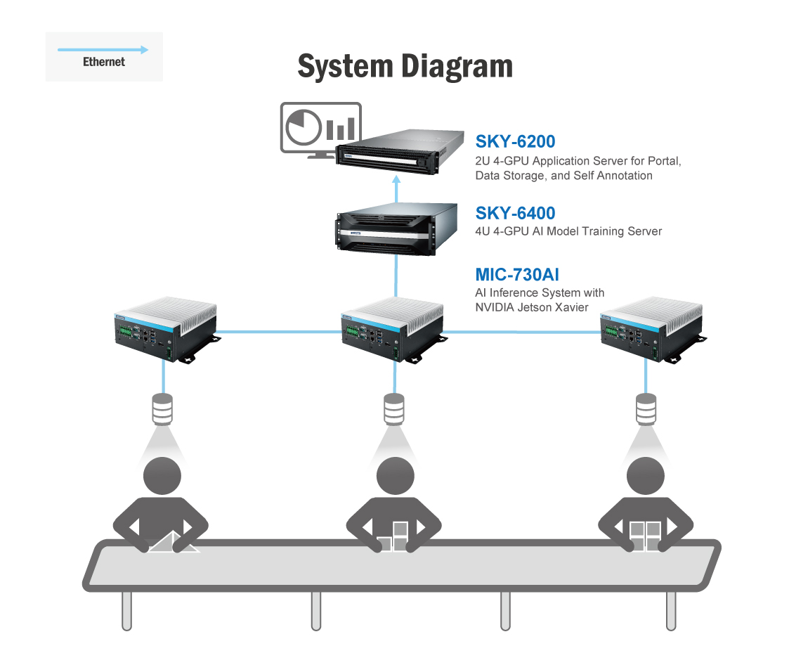 MIC-730AI phụ trách thu thập dữ liệu hình ảnh. Hai máy chủ SKY Series khác chịu trách nhiệm suy luận mô hình tính toán và tích hợp, hiển thị và phân tích dữ liệu phụ trợ. Người dùng được hưởng lợi từ hiệu quả tính toán mạnh mẽ của GPU và tiến hành tự tối ưu hóa và đào tạo AI.