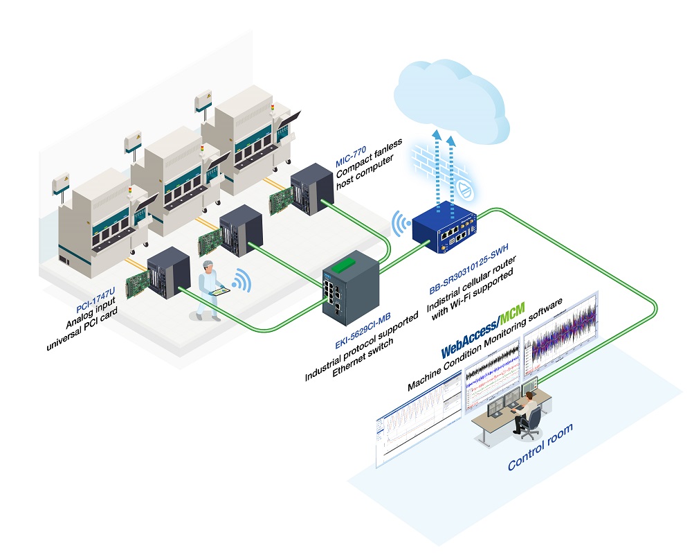有鑑於此,研華提供一站式解決方案以及相關服務。導入研華先進的測量技術,LCD 工廠可實現更優良的系統監控,每台 LCD 光罩對準曝光機與 DAQ 系統互連,將設備資料傳送至線上平台。此系統中部署的裝置包含用於有線網路通訊的工業乙太網路交換器 EKI-5629CI-MB、用於無線資料傳輸的行動通訊路由器 BB-SR30310125-SWH、採用 Intel 第 8 代 Core i 處理器的精簡型無風扇系統 MIC 770、類比輸入通用 PCI 卡 PCI-1747U、機器狀態監控軟體 WebAccess/MCM。