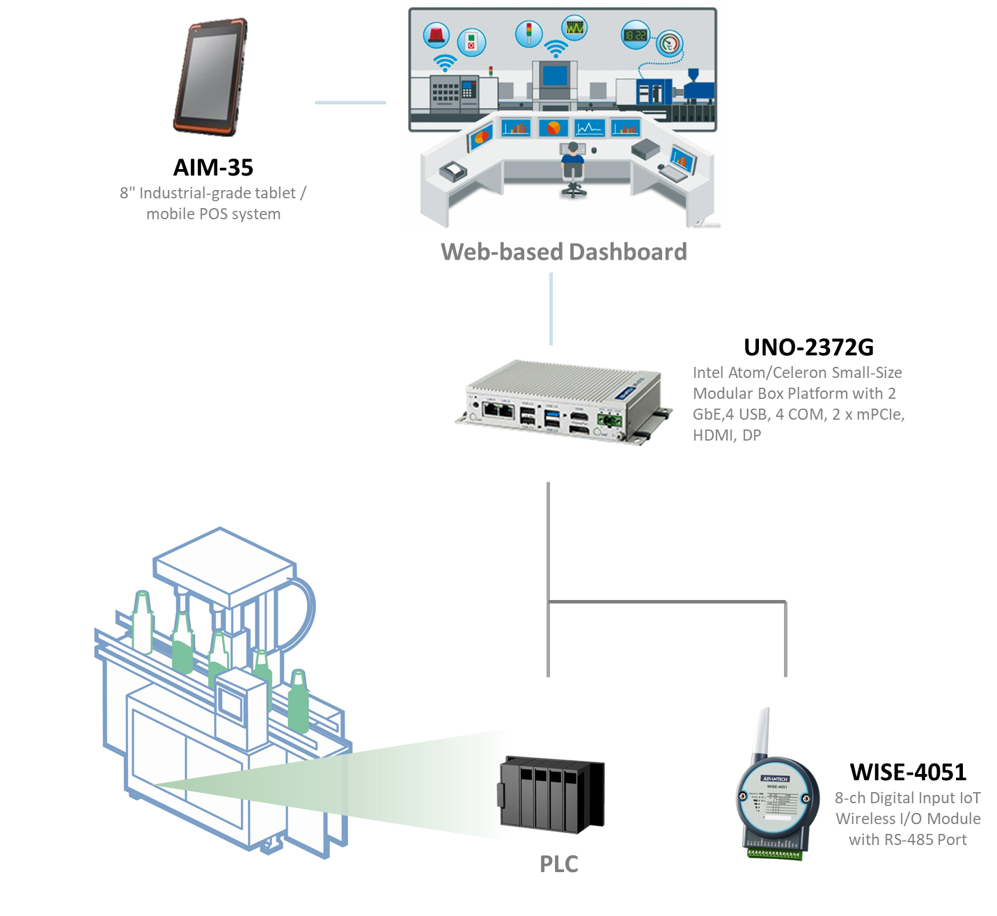 Đối với môi trường sản xuất, CGI và Advantech đã chọn máy tính công nghiệp không quạt UNO-2372G làm máy tính chính và máy chủ bảng điều khiển vì thiết kế chắc chắn, không quạt và tính mô-đun cao của nó. Máy tính UNO sẽ hỗ trợ kết nối di động cho phép triển khai ở quy mô rộng, tuy nhiên việc triển khai ban đầu sẽ tại cơ sở chính của công ty. Nó sẽ giám sát các quy trình sản xuất và PLC của máy móc, cho phép báo cáo các thông tin của dây chuyền sản xuất, những dữ liệu lỗi, cho phép giải thích, phân tích và giải quyết vấn đề chính xác.
