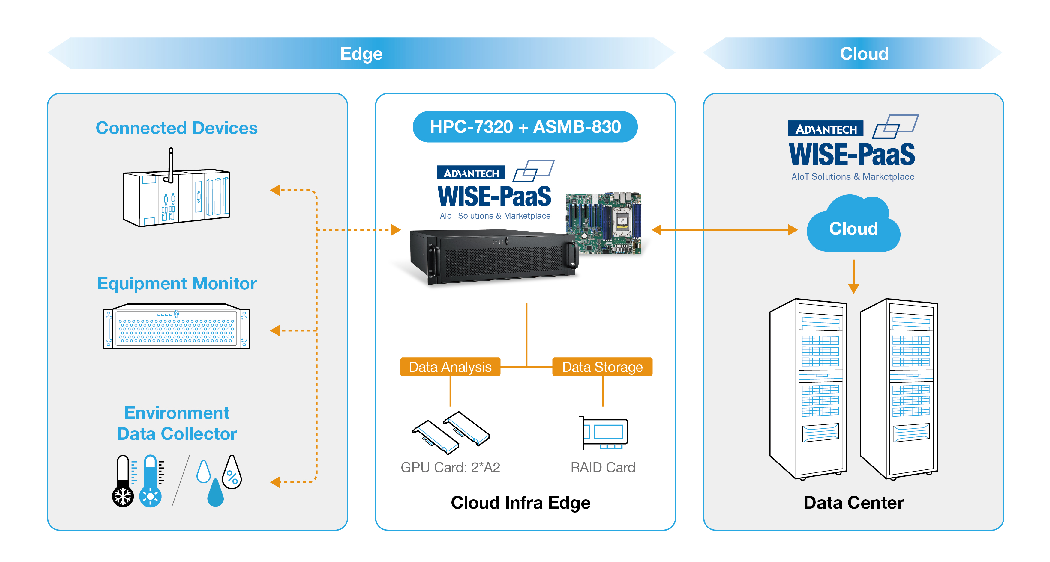 WISE-PaaS, nền tảng đám mây công nghiệp Advantech AIOT, trên WISE-STACK cung cấp một môi trường dịch vụ và phát triển cho các hoạt động quản lý năng lượng. Dữ liệu sản xuất của nhà máy được thu thập và truyền tới một đám mây riêng để phân tích và xử lý theo thời gian thực trên máy chủ biên của cơ sở hạ tầng. Mô hình điện toán đám mây biên kết hợp này cho phép các chiến lược phân bổ tài nguyên miễn phí, trong đó tài nguyên tập trung có thể được sử dụng cho khối lượng công việc máy tính chuyên sâu trong khi các thiết bị biên xử lý khối lượng công việc yêu cầu xử lý gần thời gian thực.