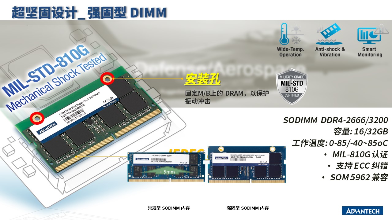 研华科技内存条SQRAM产品系列,产品接口金手指部分采用工业级的30u”镀金工艺加固,以防经常性的插拔动作带来的磨损. 同时在应对震动较强的场景时,会有客制化的加固板型,通过固定孔把产品固定在板子上,通过点胶等方式进行防抗防震。此外,在应对各种宽温工作场景时,研华内存条产品也提供不同温度的斛方案,如车规级的-40°C~125°C,工规级的-40°C~85°C等产品。