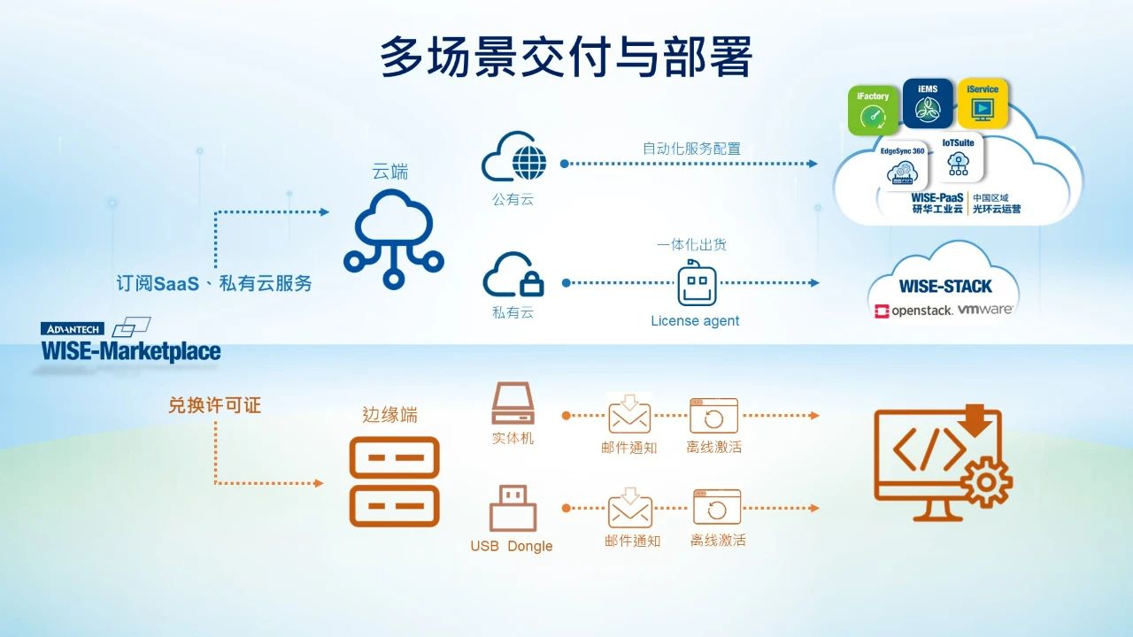 在交付模式上,邓永友介绍研华提供了统一、灵活的应用交付授权机制,支持多种场景,包括公有云、私有云和边缘设备各种形式: