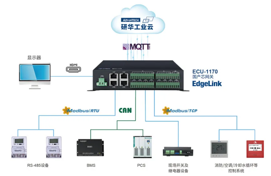 研华打造了以ECU-1170边缘智能网关为核心、iEMS智慧能源管理平台为支撑的一体化解决方案,构建“边缘层+平台层”的双层架构,实现发电、储电、用电、检电全环节智能化管控,从根源上解决传统场站运营痛点。