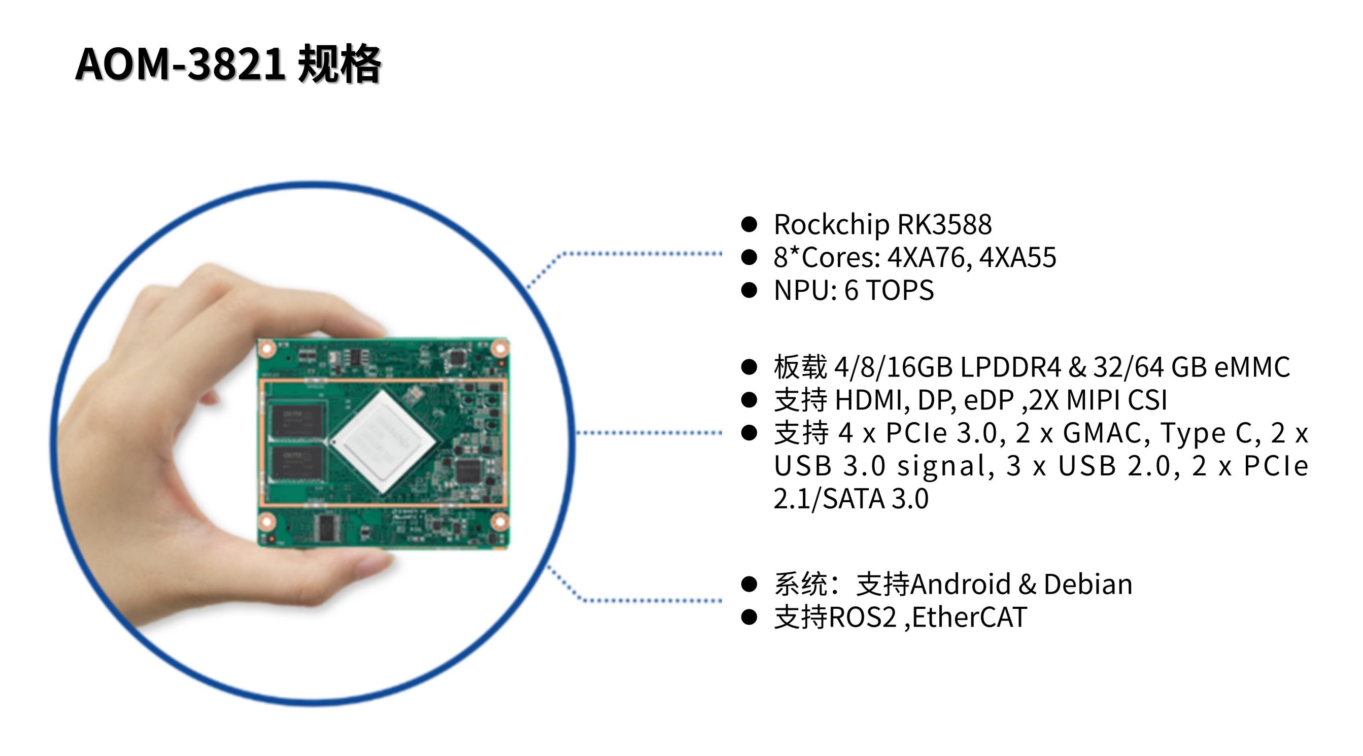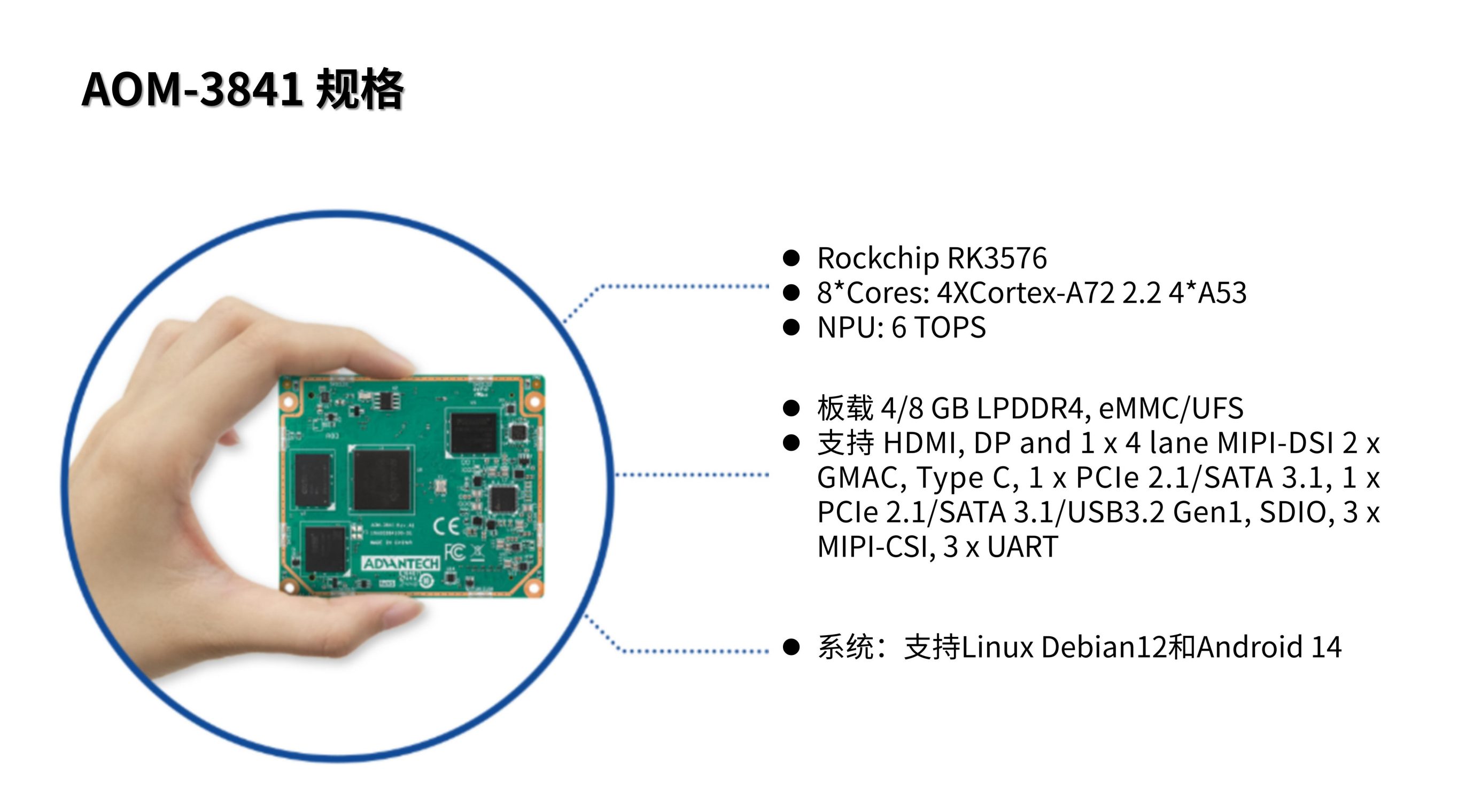 AOM-3841核心模块搭载瑞芯微RK3576,集成了DP、HDMI、MIPI DSI多种显示接口,以及3路MIPI-CSI和2路CAN总线,为新一代工业、智能应用,提供了低功耗、高性能的完整解决方案。