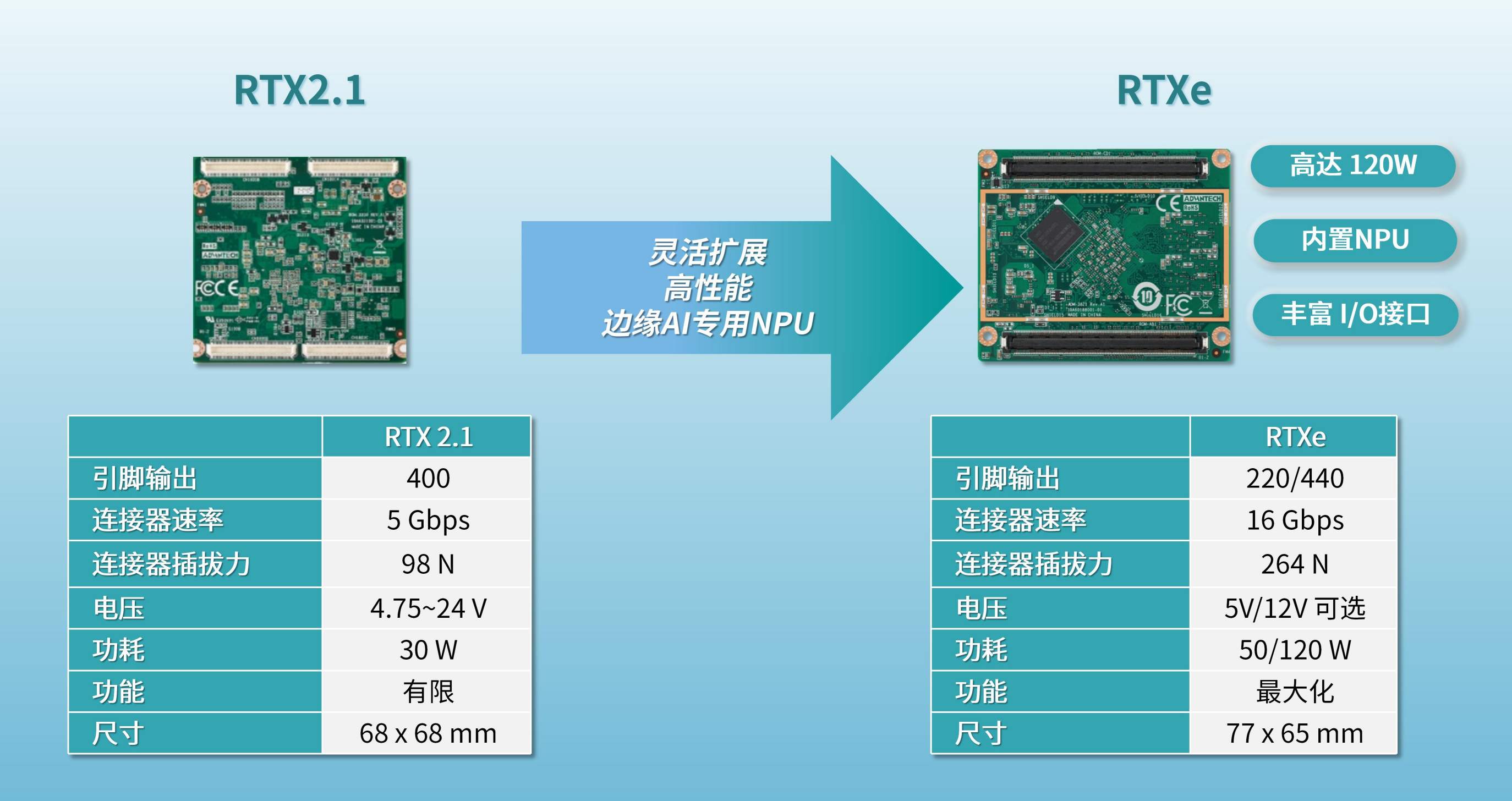 随着边缘计算市场对性能和I/O接口的需求增加,研华推出升级标准RTXe,其采用了与 COMe相同的B2B连接器,通过了EIA-364系列冲击振动标准,核心模块的振动能量水平可达 3.5 Grms ,满足工业或车载等严苛场景。此外,RTXe PCB板厚度达2.0毫米,进一步增强了模块的抗弯曲与抗震动能力。