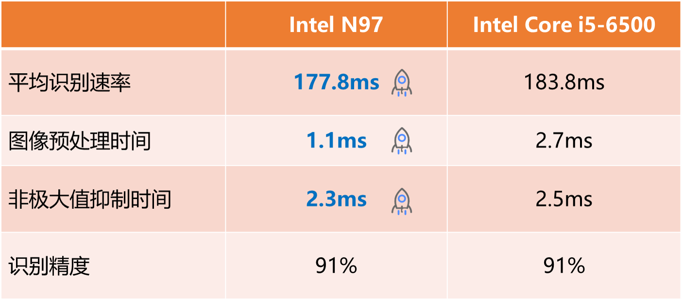 在运行如YOLOv5目标检测模型时,采用同一批图片,在识别精度相当的情况下,N97识别速率也能够达到略优于I5-6500的表现。
