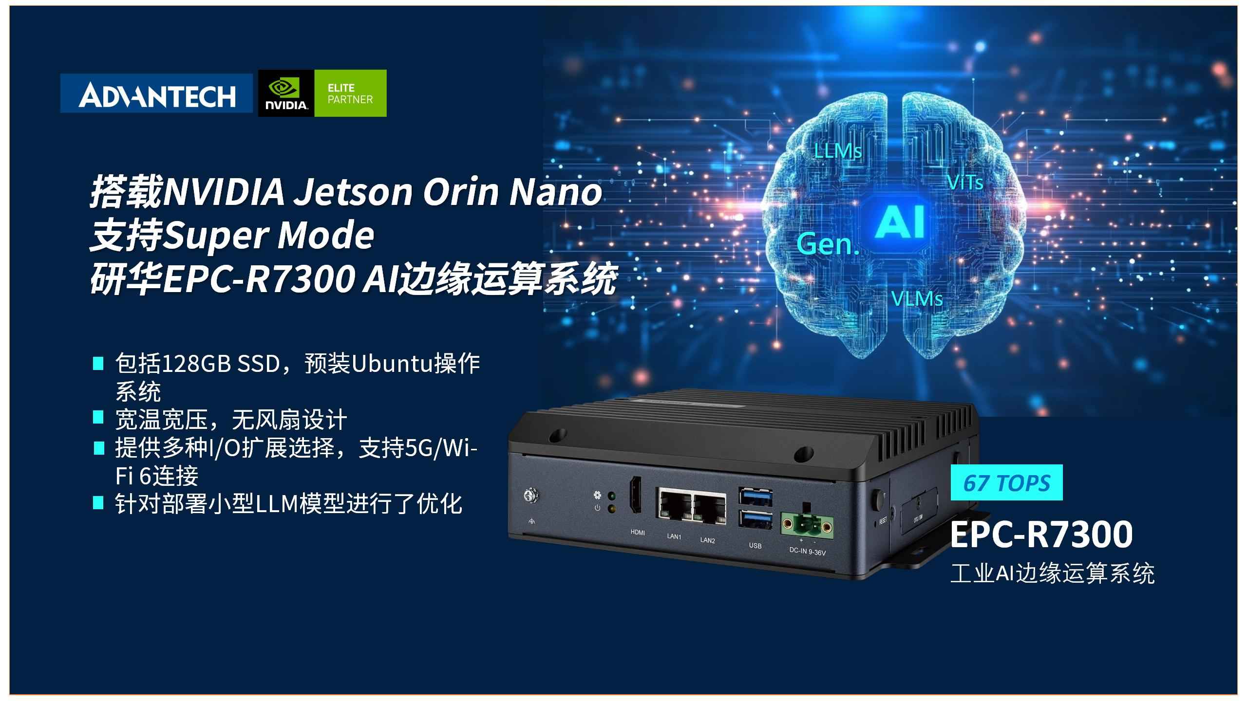 2025年1月 — 研华科技,作为前沿工业嵌入式 AI 解决方案供应商,宣布推出搭载NVIDIA Jetson Orin Nano 8GB系统模块的AI边缘运算系统,EPC-R7300 Orin Nano Super。凭借强大的NVIDIA Jetson Orin平台与软件升级,EPC-R7300提供高达67 TOPS的AI性能,且功耗极低(25 瓦)。其极精巧的设计(152×173×50cm)并预先搭载 Ubuntu 操作系统,优化AI部署,使其成为小规模大语言模型(LLMs)、视觉语言模型(VLMs)和视觉转换器(ViTs)等下一代生成式AI应用的理想选择。