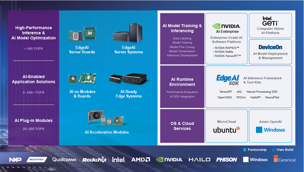 在軟體部分,研華根據AI導入流程各階段的需求提供相應軟體工具。首先在AI模型開發階段,研華導入NVIDIA AI Enterprise與Intel Geti來協助客戶產生符合需求的AI模型。其次在AI模型生成後,客戶需要打造一個 AI 完備的開發環境,而研華提供的Edge AI SDK軟體平台,可以整合各silicon夥伴的AI SDK與研華硬體平台的底層驅動程式和作業系統,提供一個可靠與穩定運行的Edge AI開發環境。第三,訓練完成的AI模型需要部署到裝置上進行推論運算,此時可以透過研華DeviceOn遠端管理平台將模型佈建到每個邊緣裝置與設備上,讓邊緣AI應用能夠真正落地帶來效益。