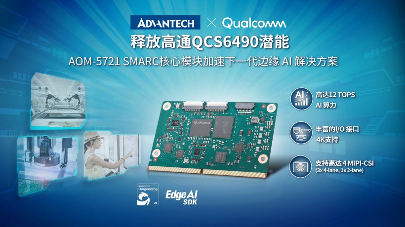全球边缘计算和边缘AI解决方案提供商研华推出SMARC核心模块AOM-5721。其采用高通跃龙(Qualcomm Dragonwing)QCS6490芯片,提供i3级性能和高达12 TOPS的AI推理能力,TDP仅为12W,具有自动光学检测(AOI)、工业自动化和零售创新等高要求边缘AI应用所需的小尺寸和低功耗。